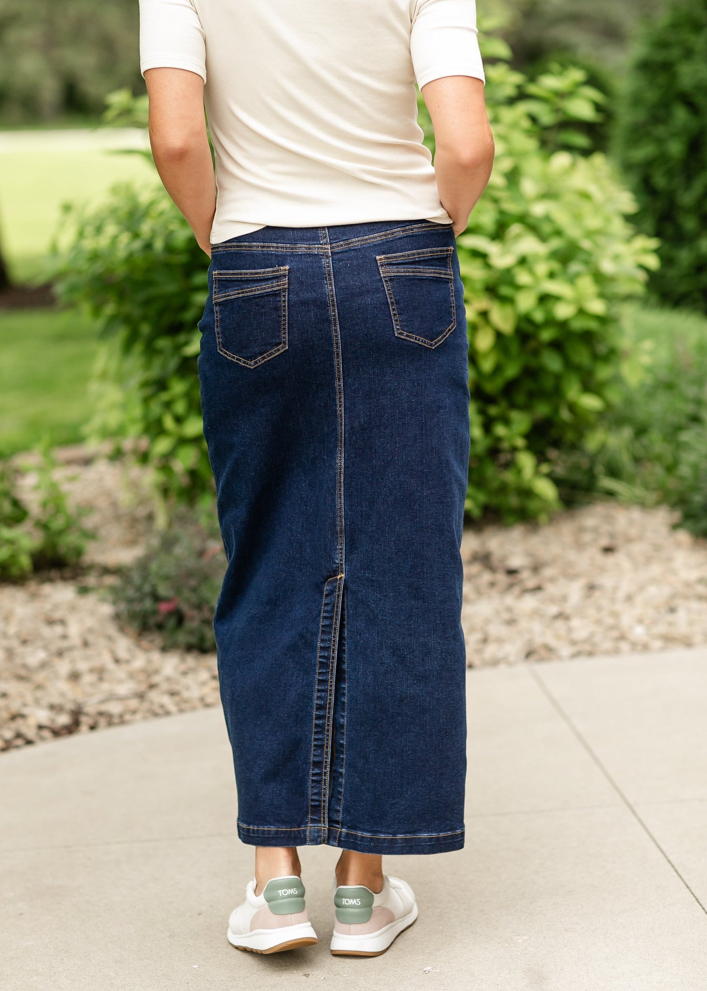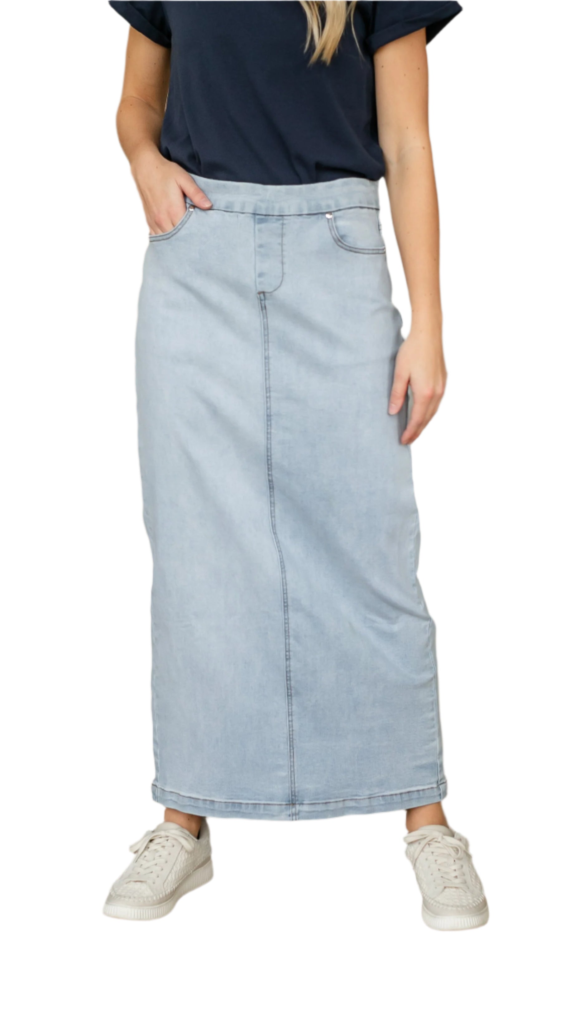 The Donna Maxi Denim Skirt is a versatile and stylish wardrobe staple. This exclusive Inherit Design features a stretchy elastic waistband for a comfortable, flattering fit that moves with you. Made from soft, flexible denim with just the right amount of stretch, it offers ease of movement without sacrificing style. Available in classic light and dark washes, it pairs effortlessly with any top. Functional front and back pockets add practicality while maintaining a chic, modest silhouette. Perfect for dressing up or down, this semi-fitted skirt is true to size and delivers in 5-10 days.