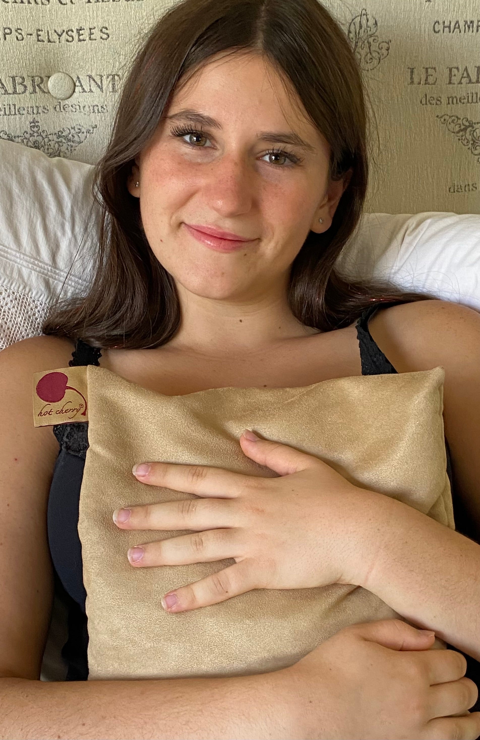 The 8S Cherry Stone Therapy Pillow in an extra-large size comes beautifully packaged in an eco-conscious pie box, tied with a black grosgrain ribbon. Designed for those who appreciate natural hues, luxuriously soft fabric, and a substantial feel, this 12.5" by 12.5" pillow holds 3 pounds of cherry pits. Ideal for hot or cold therapy, it provides soothing comfort, gentle warmth, and deep relaxation. Delivery is within 5-10 days.