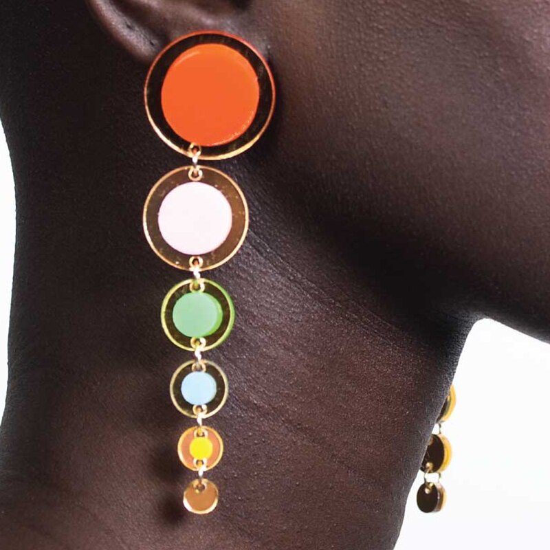 These Golden Colorful Round Tassel Drop Earrings are a must-have addition to your wardrobe. Crafted from zinc alloy with colorful acrylic accents, these earrings are 12cm/4.7" in length and 3.2cm/1.25" in width. Enjoy approximately 25-30 days of delivery for these eye-catching earrings.