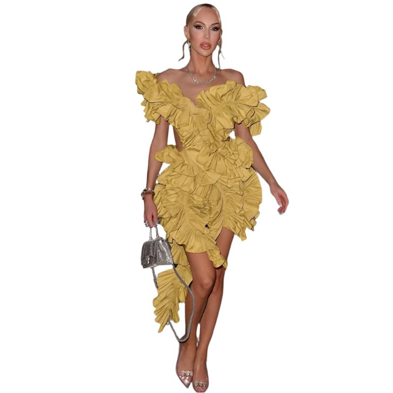 This stylish tree fungi ruffle tierred dress features a V-neckline, slim fit, and knee-length cut. It's made of high-stretch, breathable polyester and spandex, perfect for the Spring/Summer season. The empire waistline and asymmetrical silhouette create an ultra flattering look. Delivery within 18-22 days.