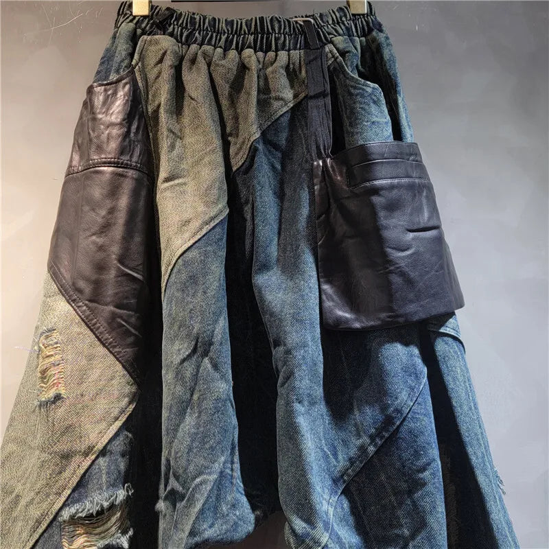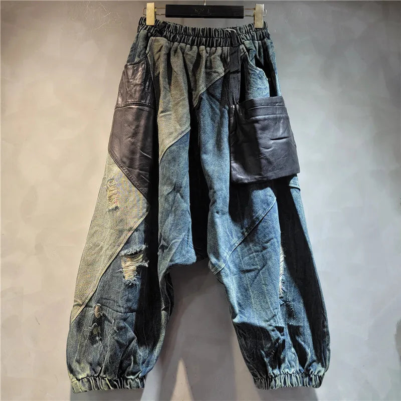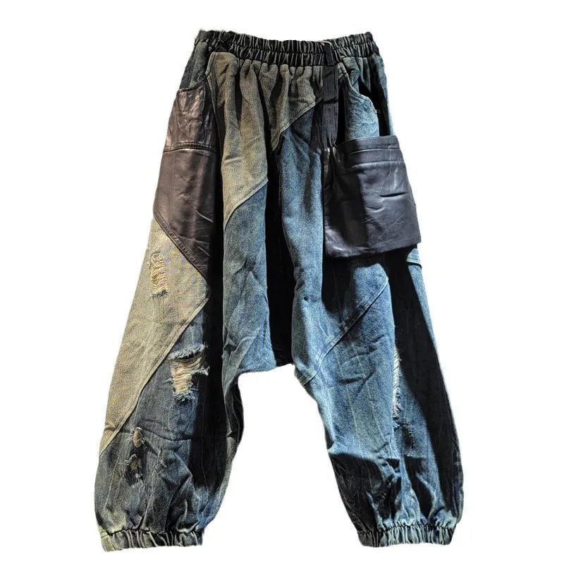 TEEK - Blue Patchwork Baggy Pocketed Elastic High Waist Denim Pants