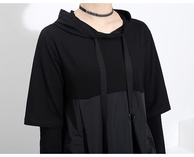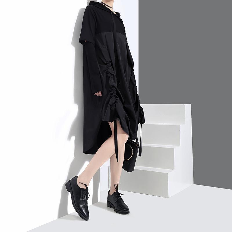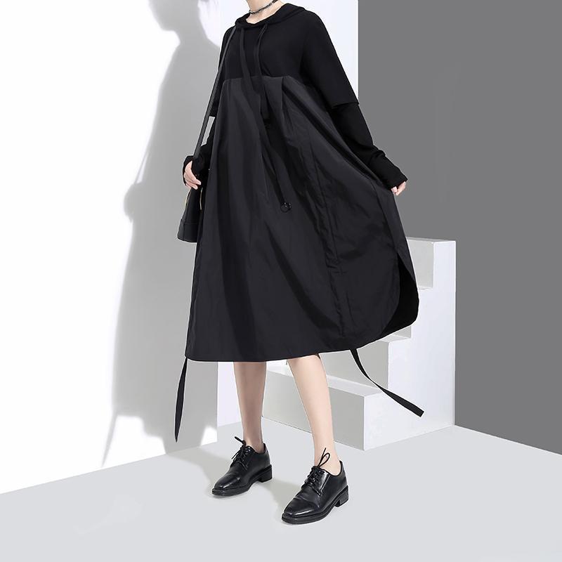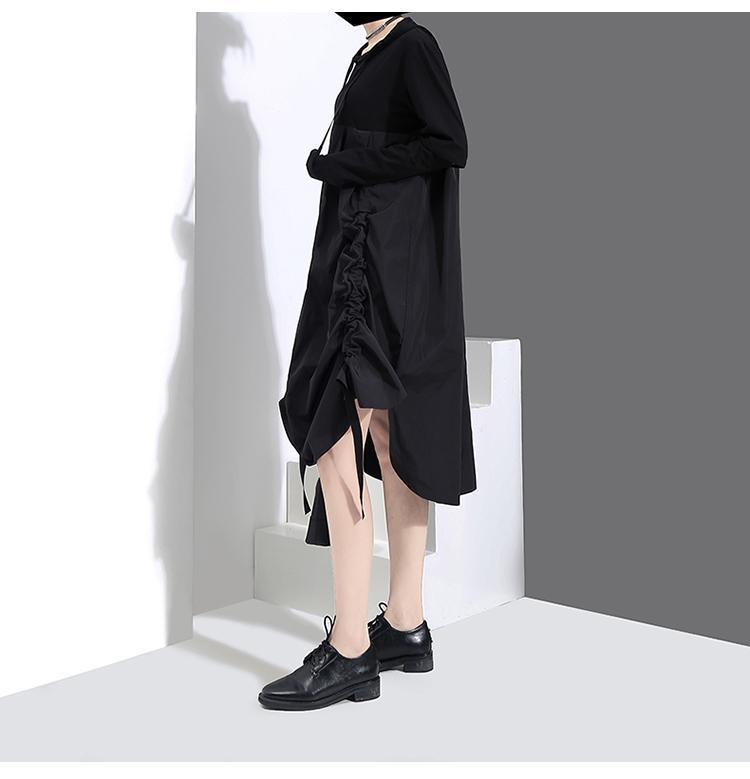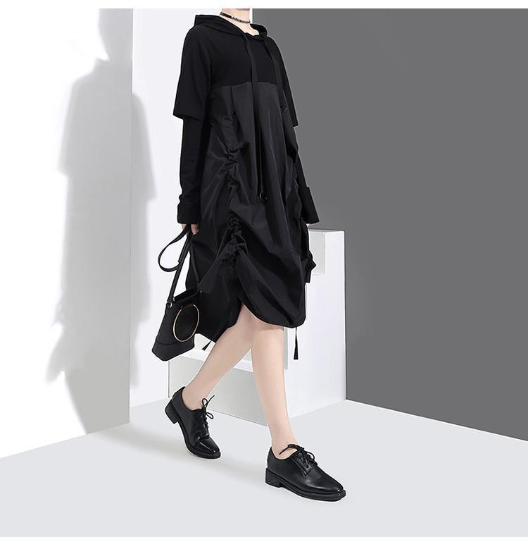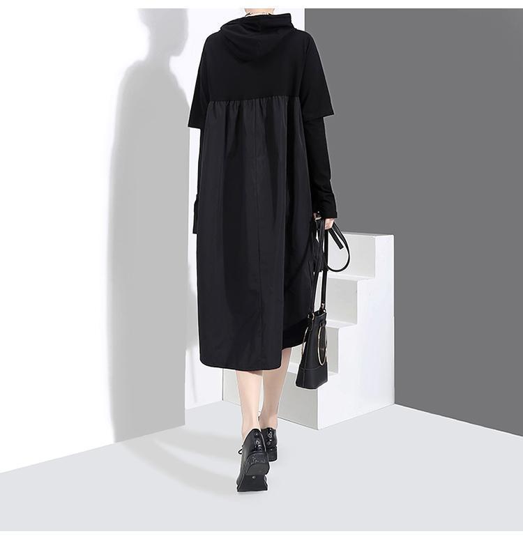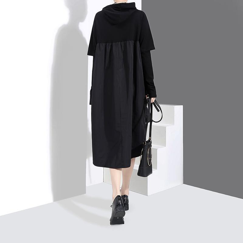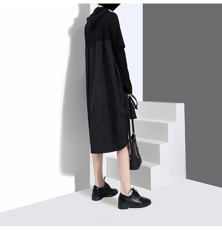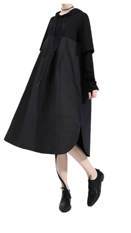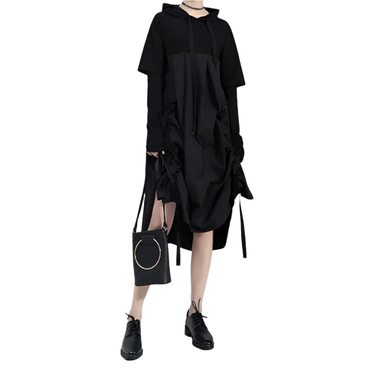 The Lindy Ruched Babydoll Dress features a knee-length silhouette with an asymmetrical design and full-length sleeves. Made with a blend of spandex, cotton, and rayon, this dress features a unique patchwork pattern and a hooded neckline. It is available in black and offers fast delivery within 4-8 days for women.