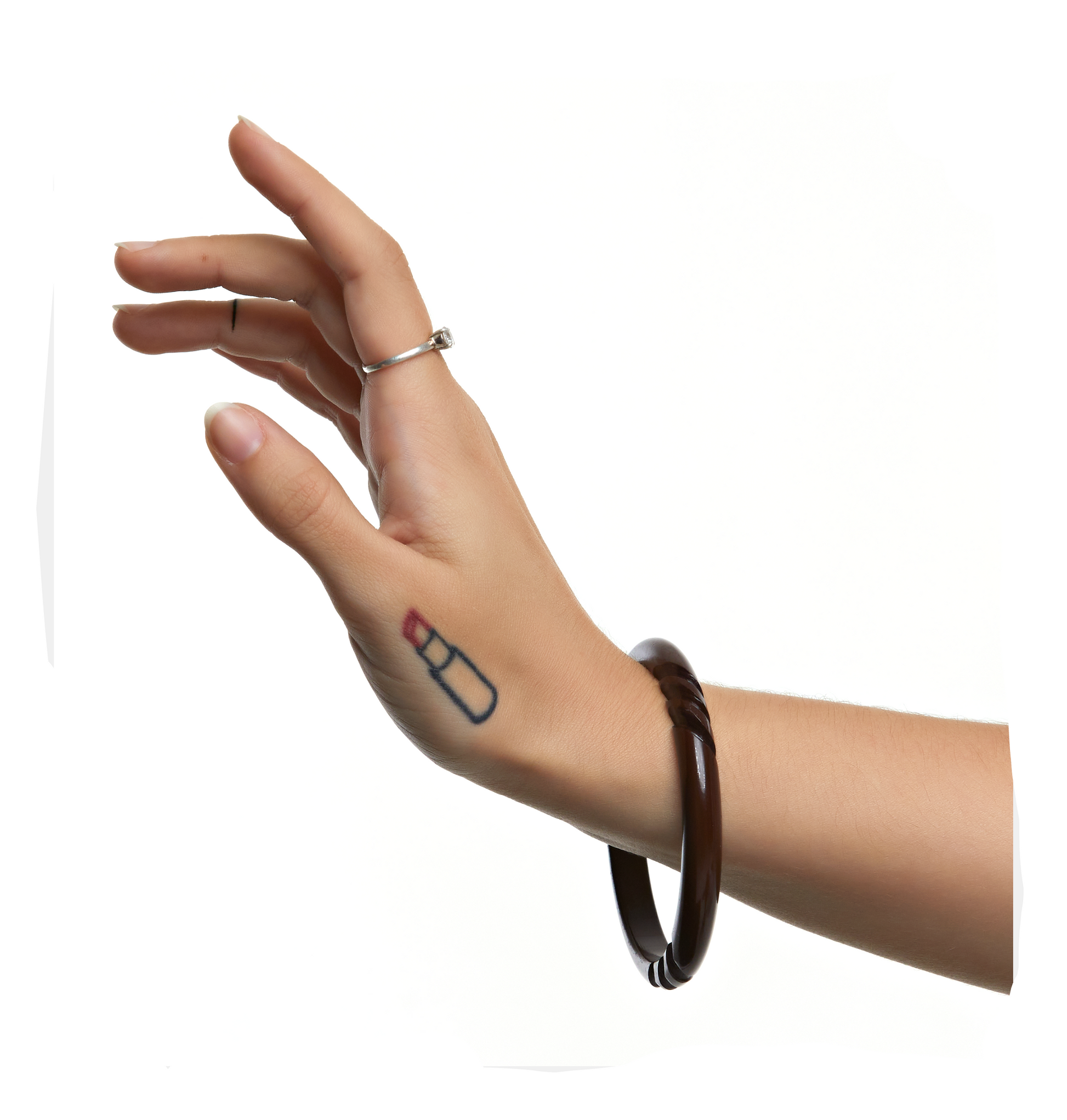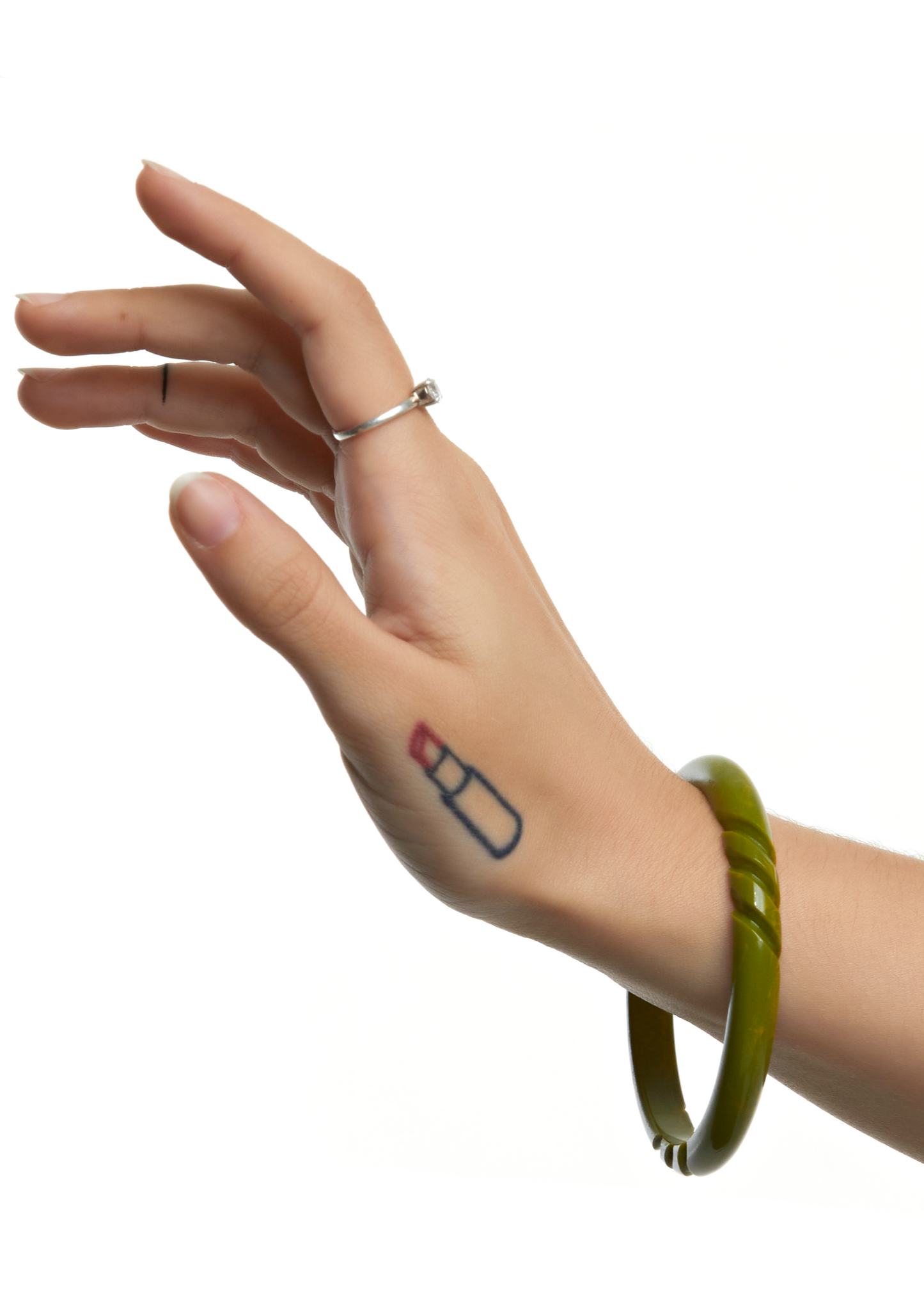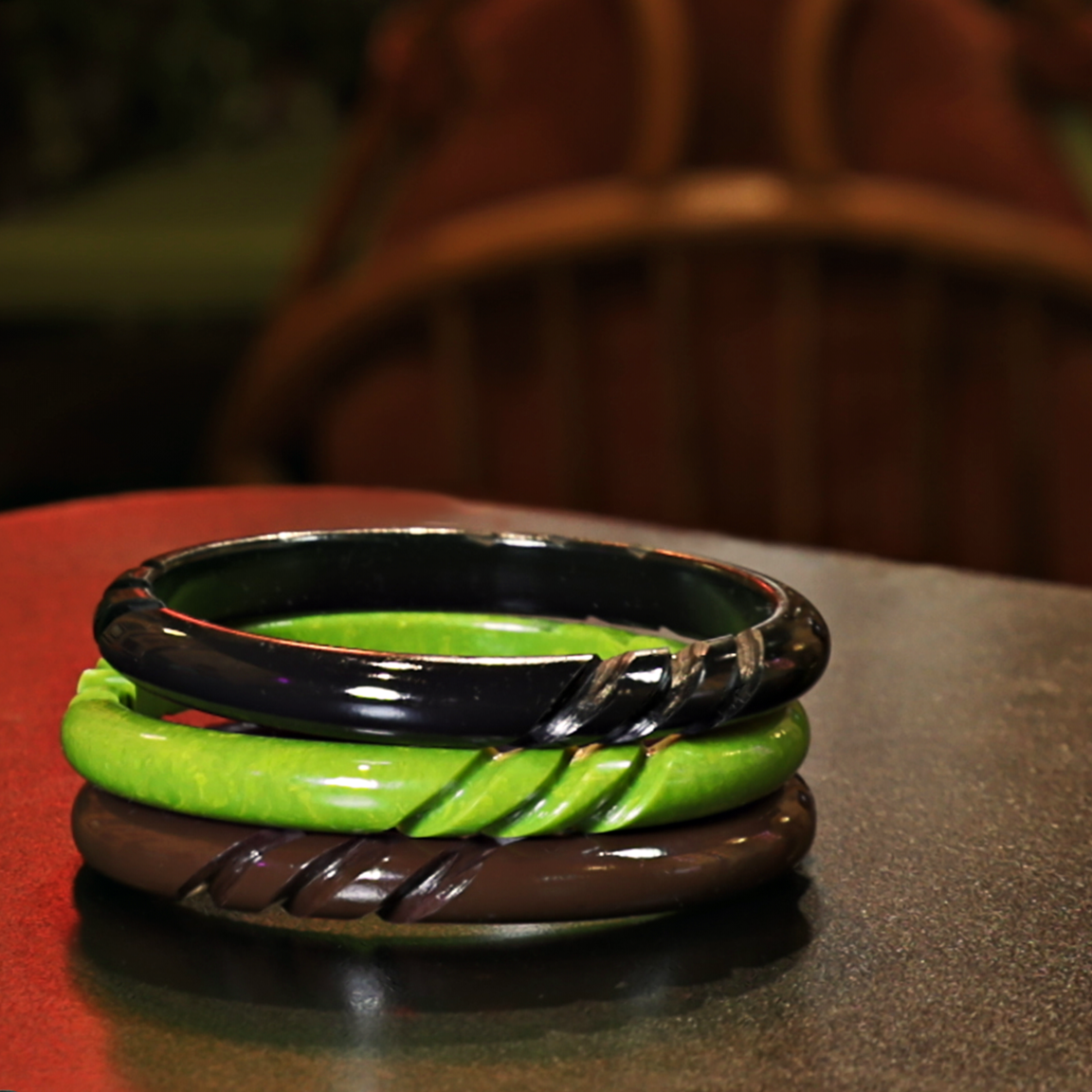 Discover the captivating Luau Lounge Collection with the Swizzle Spacer bracelet, now back in stock! Inspired by Dallas' Swizzle Luau Lounge, this hand-carved Lucite bracelet features deep notches carved three times around its circumference, perfectly complementing our Martiki and Aloha Jen cuffs. Crafted to be weighty and richly detailed, these bracelets evoke the charm of classic Bakelite with a Tiki twist. Available in Queen size (2 1/2" inside diameter) and three stunning colors: Pitch, Fern, and Teak. Durable and water-friendly, just avoid direct contact with aerosols to keep colors vibrant. Sold individually. Delivery in 5-10 days.