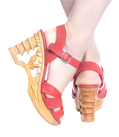 Indulge in the captivating charm of these 3" wedges, featuring a stunning Pagoda and delicate scrolls and foliage intricately carved into the heel. Adorned with a striking Red Suede and Leather strap, these shoes are a true statement piece that will leave a lasting impression. The lightweight wood heel is hand-carved for durability, yet surprisingly light. The soft and padded Red vinyl vamp, paired with a Red suede ankle strap lined with soft Red leather, provides ultimate comfort and support. With non-skid rubber at the front and back, these shoes will keep you on your feet all day. Please note: these shoes run a FULL SIZE SMALL. It is recommended to go up one size, unless you have very narrow feet. The footbed is cushioned with 3 layers of padding, ensuring maximum comfort. Each pair comes with a crepe satin dust bag for convenient storage. Delivery typically takes 4-8 days for women's sizes.