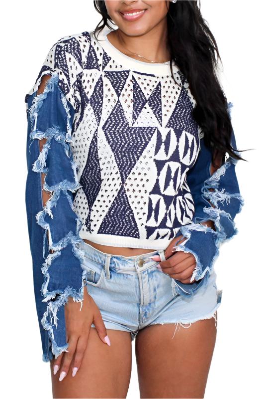 Capture attention with a captivating geometric design. Combining triangles and diamonds in a seamless fusion of blue, white, and black shades, this top boasts a distinctive pattern. Embrace a touch of distressed elegance with frayed edges and cut-out star accents, adding an edgy element to your outfit. With a cropped length that sits above the waist and star-shaped sleeves, this sweater exudes a relaxed yet chic vibe. Made of 100% polyester stretch fabric, it offers both style and comfort. Delivery in 6-10 days.