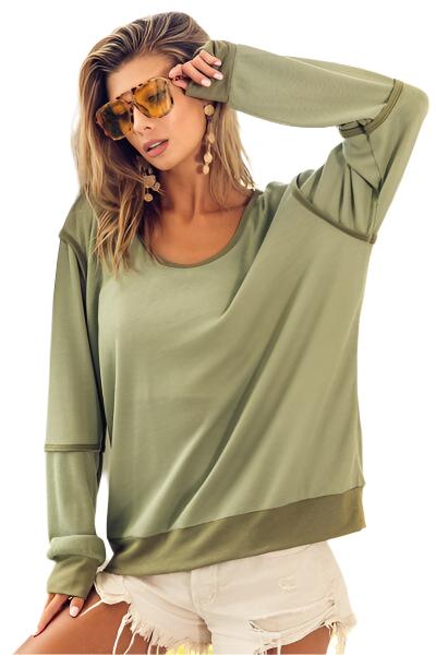 TEEK - Olive Waffle Knit Contrast Trim Long Sleeve Top