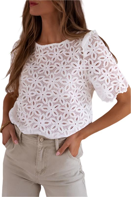 Elevate your summer style with an elegant touch! This blouse boasts a round neckline, short sleeves, and a loose fit, perfect for warm weather. The intricate crochet lace flower embroidery adds a delicate, exquisite detail to this pullover. Made from 100% polyester, this blouse will be delivered to you within 6-10 days.