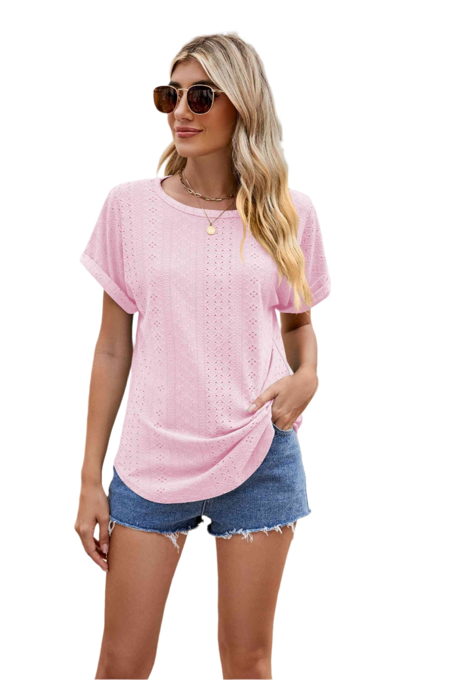 TEEK - Round Neck Eyelet Short Sleeve Top