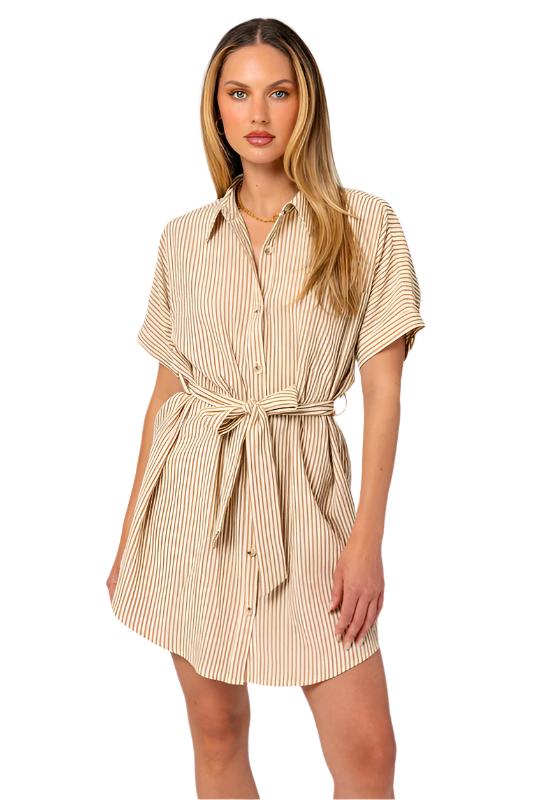 TEEK - Cream-Taupe Stripe Half-Sleeve Buttoned Shirt Dress