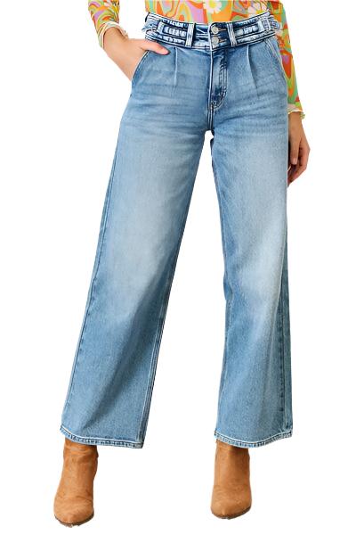 These jeans exude timeless charm while offering a comfortable stretch for effortless movement throughout your day. The classic wide-leg design and regular hem add a touch of versatility, allowing easy pairing with any ensemble. Featuring slant pockets, a zipper fly, and front pleats, these jeans seamlessly combine practicality with a chic aesthetic.