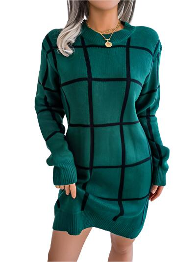 Expertly crafted with a moderate stretch and 100% acrylic material, this Plaid Round Neck Dropped Shoulder Sweater Dress offers both comfort and style. The basic style makes it a versatile addition to any wardrobe. Machine washable for convenience, this dress is perfect for colder days. Delivery in 6-12 days. Belt not included.