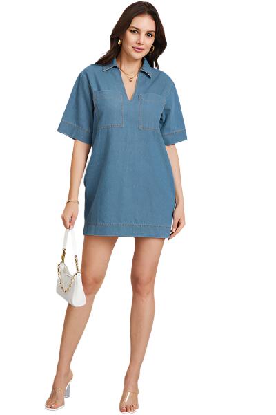 This Pocketed Collared Neck Mini Denim Dress is perfect for a versatile and effortless look. Made with a blend of 65% cotton and 35% polyester, it offers comfort and durability. The dress features convenient pockets for storage and a classic collared neckline. Machine washable for easy care. Delivery in 6-12 days. Available in medium blue for women.
