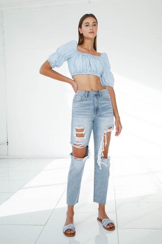 TEEK - Light Wash Ripped Raw Hem Boyfriend Jeans