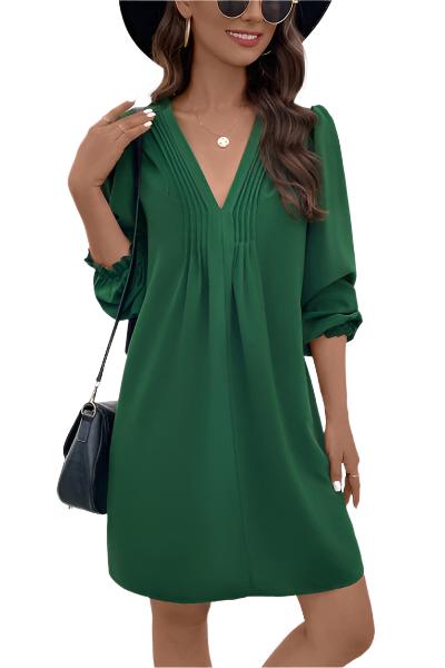 TEEK - Green Ruched V-Neck Flounce Sleeve Dress