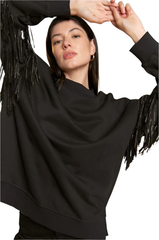 This top features plush suede with dazzling silver studs and fringe trim at the sleeves, giving it a bold and stylish look. With an oversized fit and ribbed hems, it exudes both comfort and fashion. Its exposed seaming adds a touch of edginess, while the pullover design makes it easy to wear. The dropped shoulder with long sleeves completes the effortlessly cool vibe of this top. Made of 85% cotton and 15% polyester, it offers both durability and a soft feel against the skin. Get ready to receive compliments on your new top in just 6-10 days!