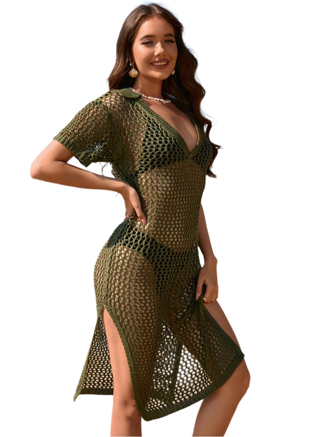 Discover the luxurious Openwork Johnny Collar Short Sleeve Cover-Up, featuring intricate openwork details and elegant slits. Crafted from a semi-sheer, slightly stretchy fabric, this premium cover-up is made from 100% acrylic and will be delivered to you within 6-10 days. Elevate your wardrobe with this sophisticated and exclusive piece.