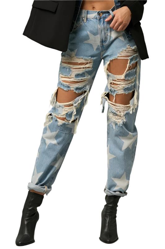 Featuring a light wash with stars and heavy distress embellishment, these Star Print Slouch Jeans have a regular, straight leg silhouette. Made from a non-stretch, non-sheer fabric blend of 95% cotton and 5% polyester, these ankle-length jeans have a button closure and are guaranteed to arrive within 6-10 days.