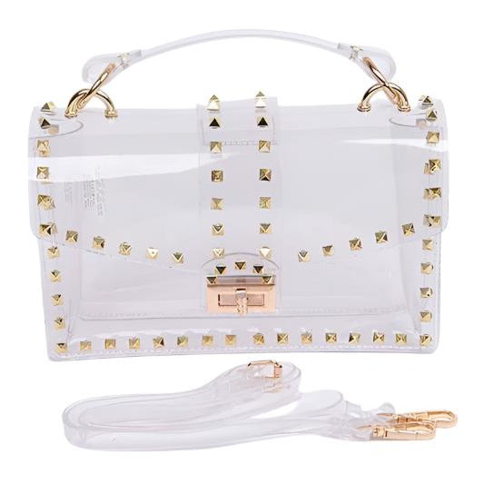 Experience the perfect blend of style and functionality with this Studded Clear Swing Bag - measuring 9.25" in length, 2.25" in width, and 5.75" in height. Crafted with Polyurethane and a mix of metals, this bag is both lead and nickel compliant. Plus, a shoulder strap is included for your convenience. Get your hands on it today and receive your delivery in just 6-10 days. Order now!
