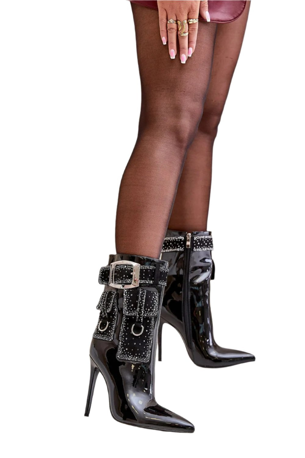 Bold stiletto boots crafted from patent eco leather, sure to captivate with their elegant and stunning style. This zippered design features warming materials for comfort during colder weather. Pointed toes add sleekness, while a decorative belt with a large silver buckle adds a unique and fashionable touch. Perfect for glamorous evening looks, these boots combine comfort and striking design. Fabricated with artificial leather and warmers, the footbed and shoe cover give a height of 7.5 inches and a heel height of 4.5 inches. Delivery is estimated to be between 6-10 days.