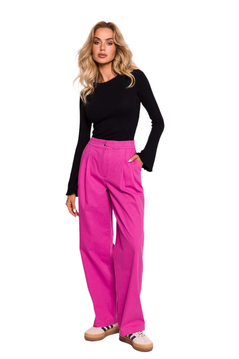 Elevate your wardrobe with these premium light casual pleated trousers. Made from high-quality cotton fabric, these trousers feature wide legs for ultimate comfort and a sophisticated look. The waist is accentuated by darts, while the elastic band guarantees a perfect fit. The snap and fly closure adds practicality, and the side slip pockets offer even more functionality. Designed and crafted with care in Poland, these trousers seamlessly combine modern style with exceptional craftsmanship. Cotton 76%, Spandex 3%, Polyester 21%. Delivery within 8-12 days.