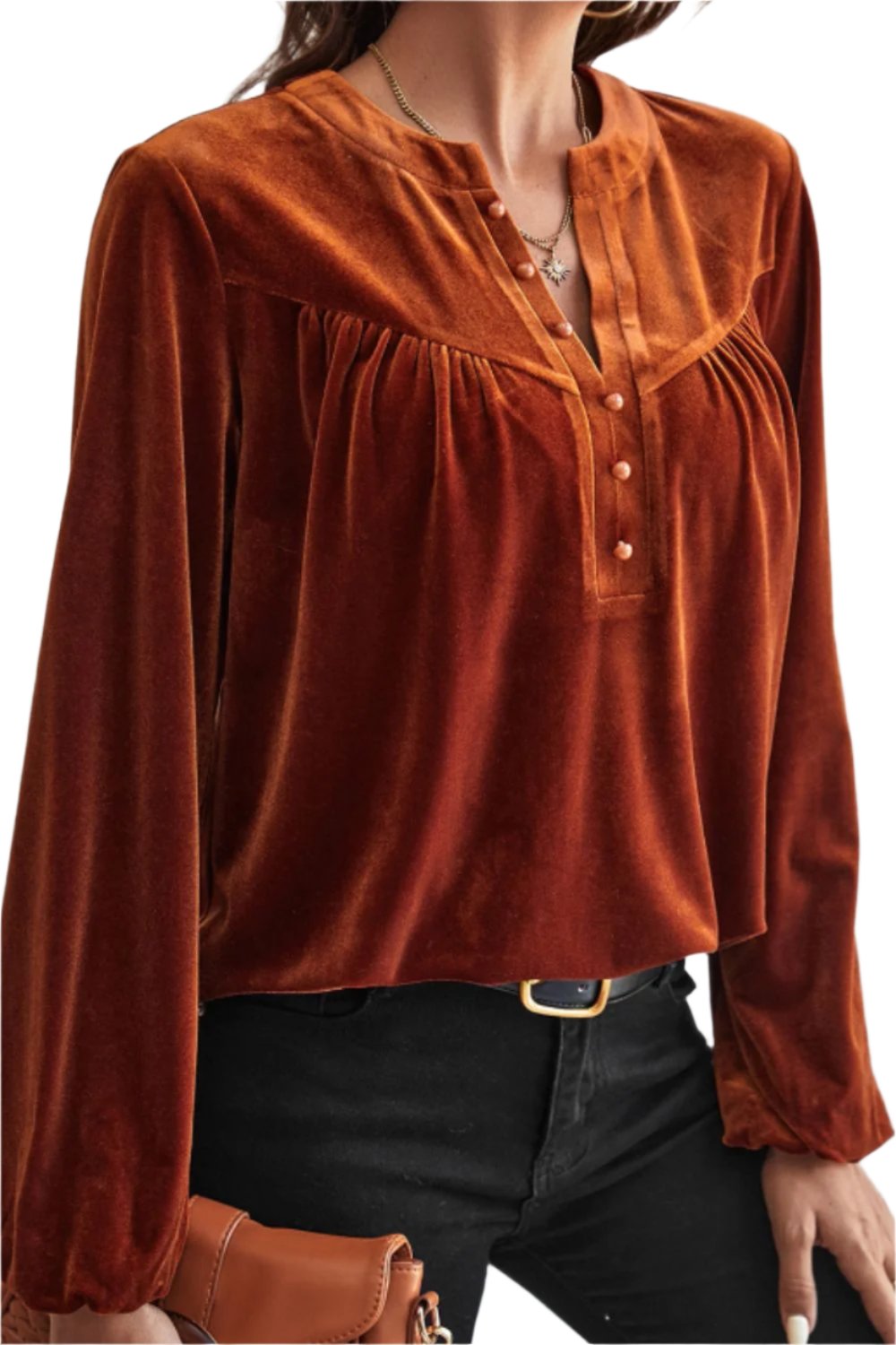 Get ready to elevate your wardrobe with this Notched Long Sleeve Velvet Top. Made from an opaque stretch fabric that offers the perfect amount of give, this top is composed of 95% polyester and 5% elastane for a comfortable and flattering fit. Plus, with delivery in just 6-10 days, you'll be rocking this stylish top in no time!