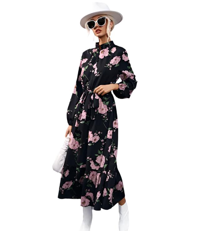 TEEK - Printed Long Sleeve Semi Collar Long Dress