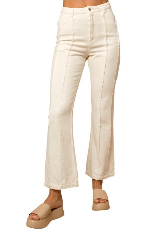 Elevate your style with Frayed Hem Flare Pants - a perfect blend of retro and modern aesthetics. These pants have a flared cut and a frayed hem, adding a unique and striking touch to your outfit. Pair them with a tucked-in top or a casual shirt for a versatile and chic look. These Casual Print / Pattern Solid Silhouette pants feature a Regular Flare Fit and Frayed Hem details, making them perfect for any occasion. Made with 97% Cotton and 3% Spandex, these pants are stretchy and non-sheer, ensuring comfort and style. Get them delivered in 6-10 days by Button/Zipper closure.