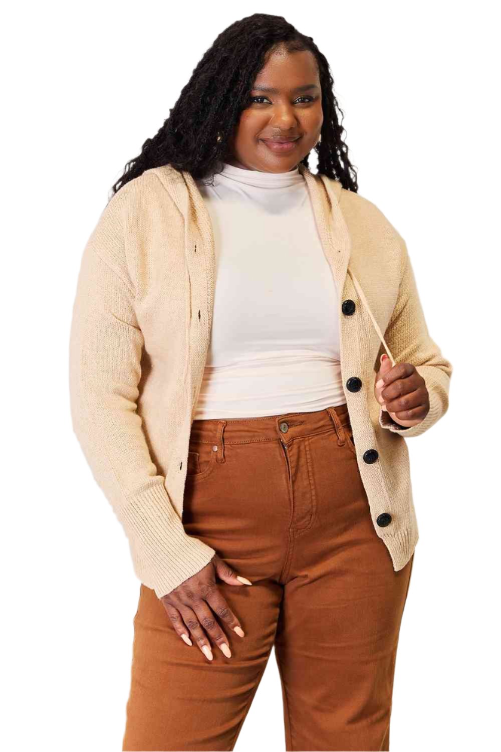 Stay cozy and stylish with this tan button-down long-sleeve hooded sweater. Featuring a hood for added warmth and comfort, this sweater is perfect for chilly days. The button-down design adds a touch of sophistication, making it a versatile piece that can be dressed up or down. Stay warm and fashionable with this must-have sweater.